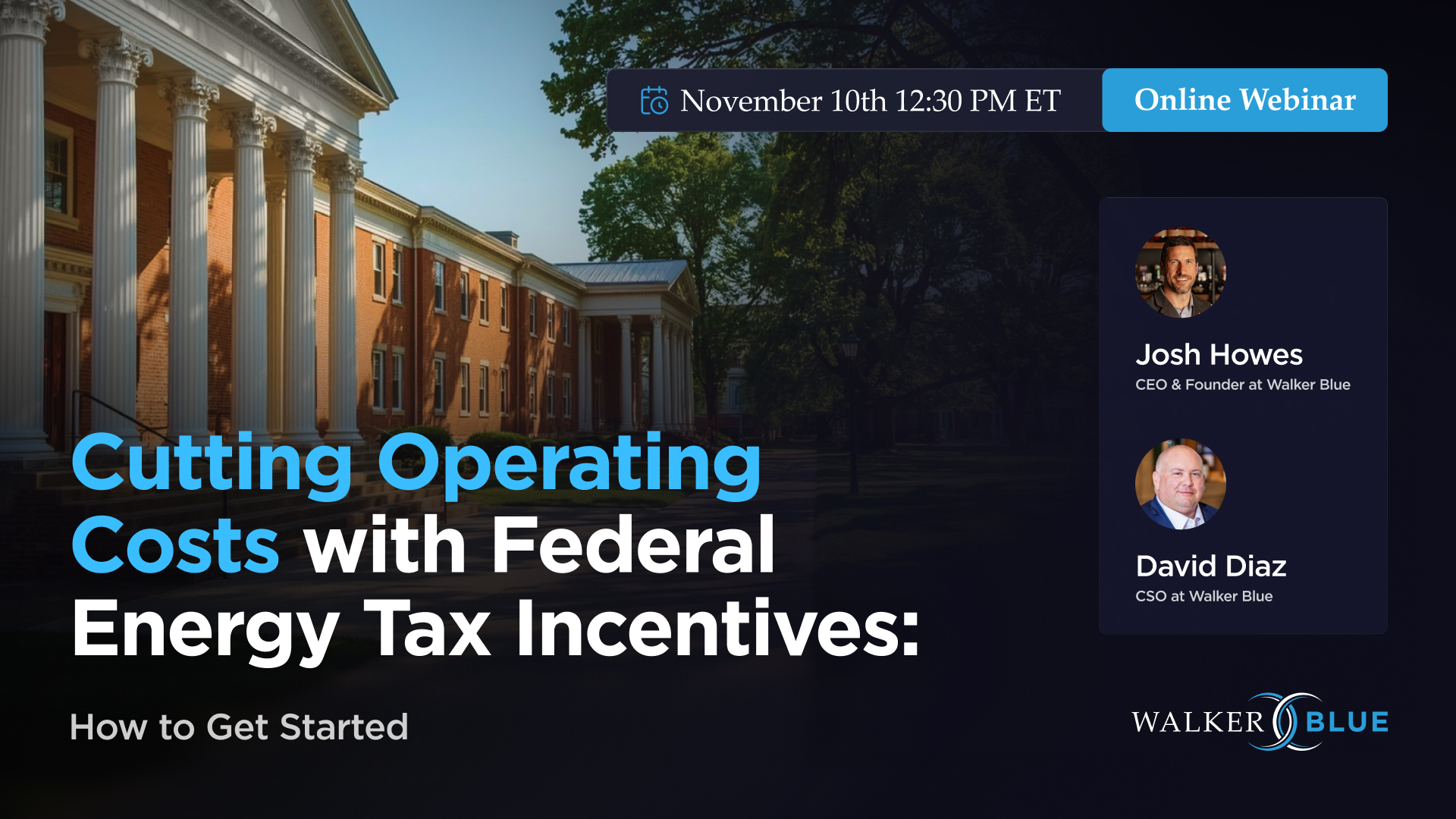 Join Walker Blue for a live webinar on January 22nd at 2pm where our team of energy engineers and tax incentive specialists will break down what every design engineer, ESCO, and architect should understand about the ITC. We’ll walk through which technologies qualify, how prevailing wage and apprenticeship compliance come into play, and what documentation is expected from the design team to support the credit.